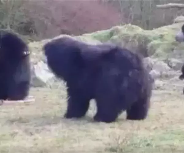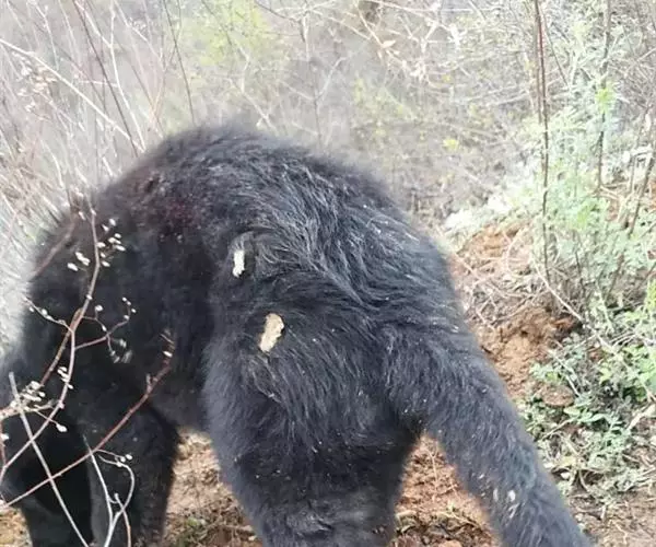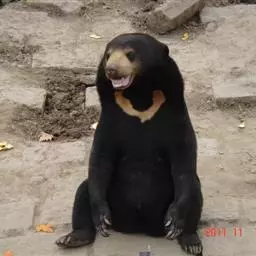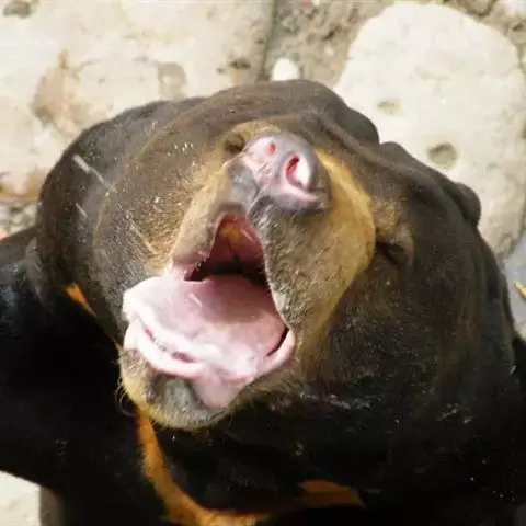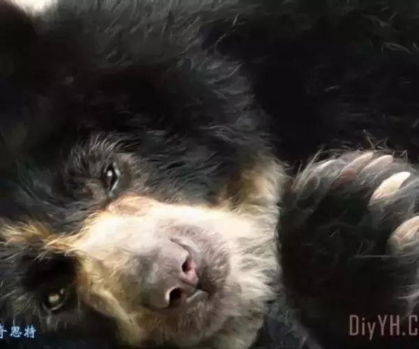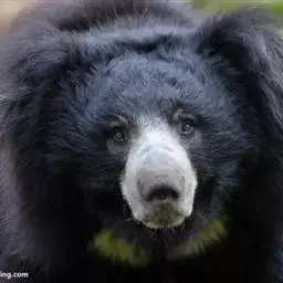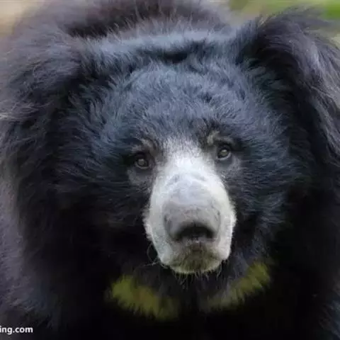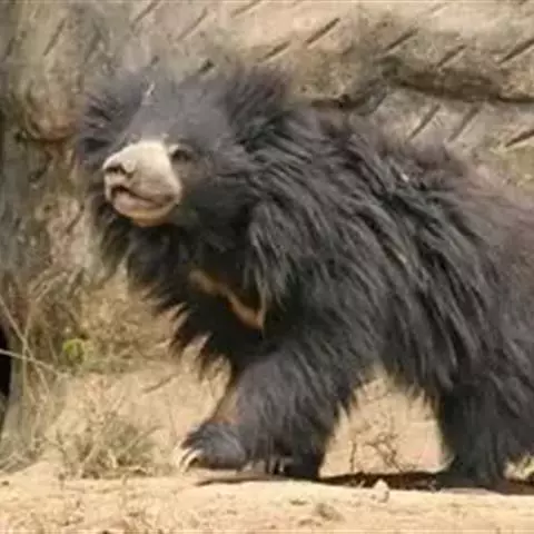 懒熊(学名:Melursus ursinus):属于熊科、懒熊属的动物。体型中等,雄性比雌性重30%至40%,雄性体重80-140千克,雌性体重55-95千克,成年懒熊的肩宽约60-90厘米,尾长15-18厘米,是熊科中最长的。懒熊全身覆盖长而蓬松的毛发,毛色浅的如赤褐色,深的可至黑色。胸部有个特别的浅的“V”字形或“ Y”形斑块,脸部毛发相对较少,毛色偏灰。吻部稍白,鼻子呈黑色。口鼻很长,能灵活移动,它们可以随意控制鼻孔闭合。懒熊的上颚只有4颗门齿,而不像很多其他种类的动物那样上下各有六颗,这样中间形成空隙就有助于它们吸食白蚁。