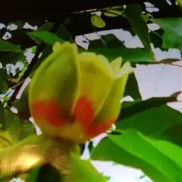 观光木 常绿乔木,高达25米, 胸径1.1米,树皮淡灰褐色,具深皱纹。小枝、芽、叶柄、叶面中脉、叶背和花梗均被黄棕色糙状毛。叶片厚膜质,椭圆形或倒卵状椭圆形,中上部较宽,长8--17厘米,宽3.5--7厘米,顶端急尖或钝,基部楔形,上面绿色,有光泽,中脉被小柔毛,侧脉每边10—12条;托叶与叶柄贴生,叶柄长1.2—2.5厘米,基部膨大。托叶痕几达叶柄中部。花两性,单生叶腋,淡紫红色,芳香;花蕾的佛艳苞状苞片一侧开裂,被柔毛,花梗长约6毫米,具一苞片脱落痕,花被片9,象牙黄色,有红色小斑点,3轮,窄倒卵状椭圆形,外轮的最大,长1.7—2厘米,宽6.5—7.5毫米,内渐小,内轮的长1.5—1.6厘米,宽约5毫米;雄蕊多数30—45枚,长7.5—8.5毫米,花丝白色或带红色,长2—3毫米;雌蕊9—13枚,狭卵圆形,密被平伏柔毛,花柱钻状,红色,长约2毫米,腹面缝线明显,柱头面在尖端,雌蕊群柄粗,长约2毫米具槽,密被糙状毛。 聚合突骨果长椭圆形,有 观光木叶子 时上部的心皮退化而呈球形,长10—18厘米,直径7—9厘米,垂悬于具皱纹的老枝上,成熟时沿背缝线开裂,外果皮榄绿色,有苍白色大形皮孔,干时深棕色,具显著的黄色斑点;每聚合果有心皮5—12个,每心皮有种子l一12粒。种子具红色假种皮,椭圆形或三角状倒卵圆形,长约15毫米,宽约8毫米。花期3—4月,果期10—12月。