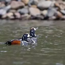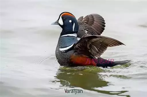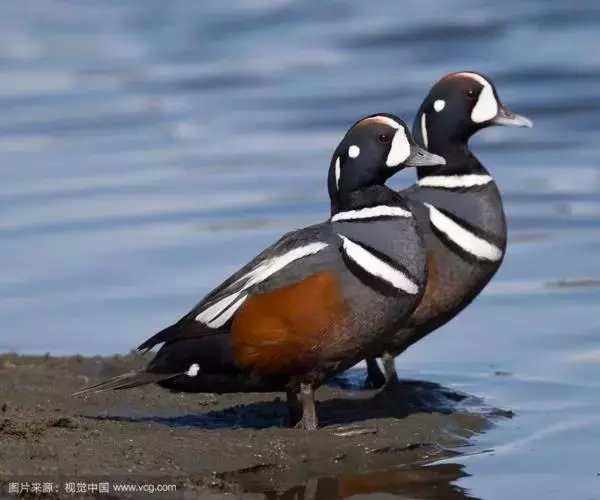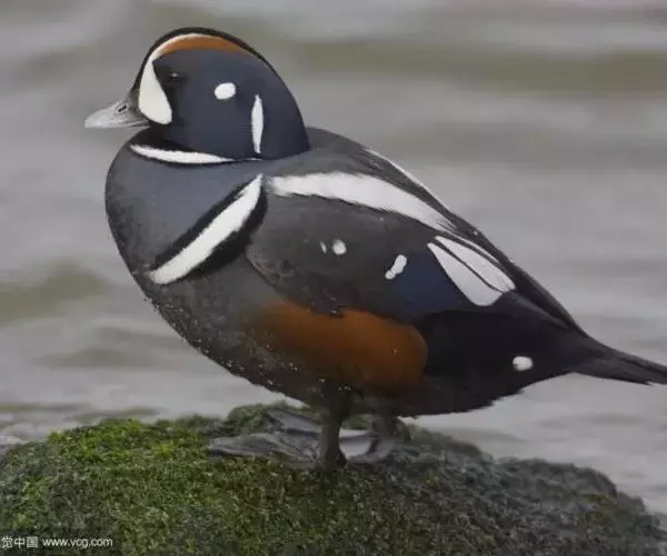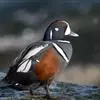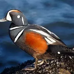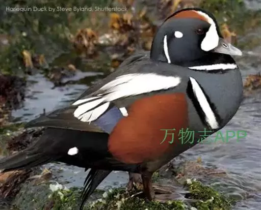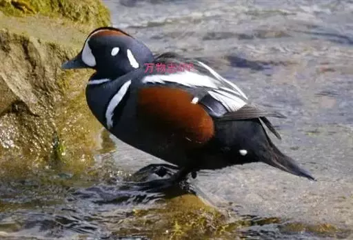 丑鸭(学名:Histrionicus histrionicus)体长33-54厘米,翼展56-66厘米,体重500-726克。具有非常丰富多彩的羽毛,酷似意大利哑剧中多姿多彩的角色——丑角,故名之。栖息和生活于溪流旁,岩石和灌丛间的深凹处,树洞中。常成对或成小群活动,非繁殖季节也集成大群。飞行迅速,但通常不高飞。主要以动物性食物为食。觅食活动多在白天。常在水流湍急的江河、山区溪流和多岩礁的海岸附近觅食。分布于冰岛、格陵兰、阿拉斯加海岸、西伯利亚东部、贝加尔湖西部山脉、阿纳德尔盆地、堪察加半岛、萨哈林岛、千岛群岛、朝鲜半岛、日本(中部),以及中国的东北(中部)、辽宁(新金、旅顺)和山东等地。