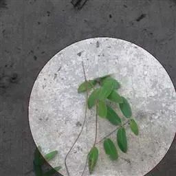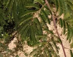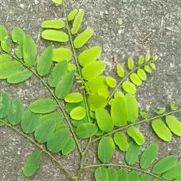叶长4-8厘米,在叶柄的上端、最下一对小叶的下方有圆盘状腺体1枚;小叶20-50对,线状镰形,长3-4毫米,宽约1毫米,顶端短急尖,两侧不对称,中脉靠近叶的上缘,干时呈红褐色;托叶线状锥形,长4-7毫米,有明显肋条,宿存。