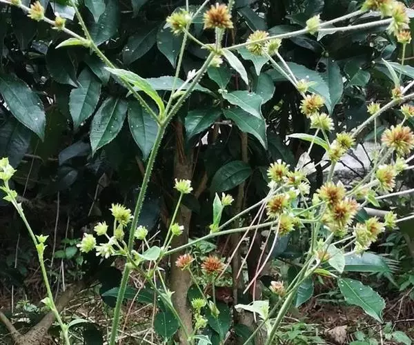 头状花序12-20个在茎枝顶端密集成团球状复头状花序,复头状花序基部有3个卵状心形的叶状苞片,具细长的花序梗,排成疏伞房状;总苞长圆形,长8-10毫米,宽1.5-2毫米;总苞片绿色,或有时顶端紫红色,外层4,披针状长圆形,长4-5毫米,顶端尖,具1脉,无毛或近无毛,内层4个,椭圆状长圆形,长7-8毫米,顶端急尖,具3脉,被疏贴短毛和腺点;花4个,花冠白色,漏斗状,长5-6毫米,管部细,裂片披针形,无毛。