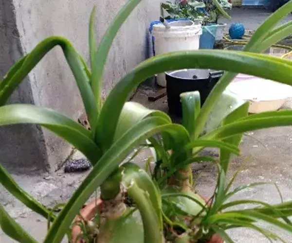 叶基生,5-6枚,带状或长条状披针形,有时稍带肉质,端部尾状长尖,长30-60厘米,宽2.5-5厘米,先端尾状并常扭转,常绿,近革质。 [1-2]