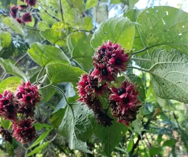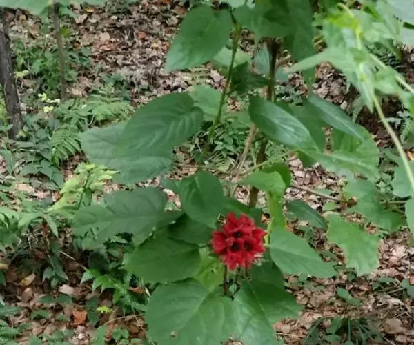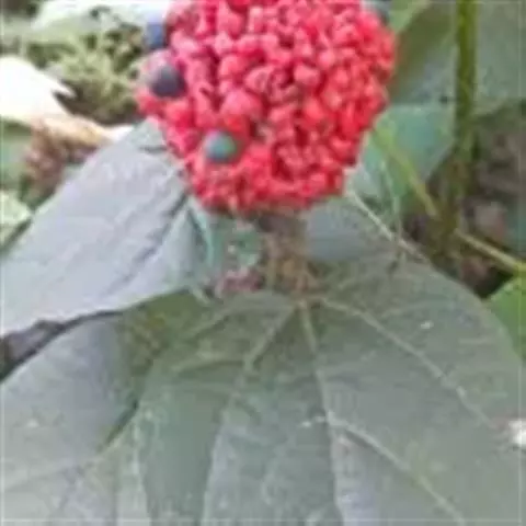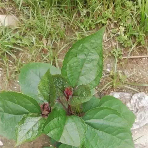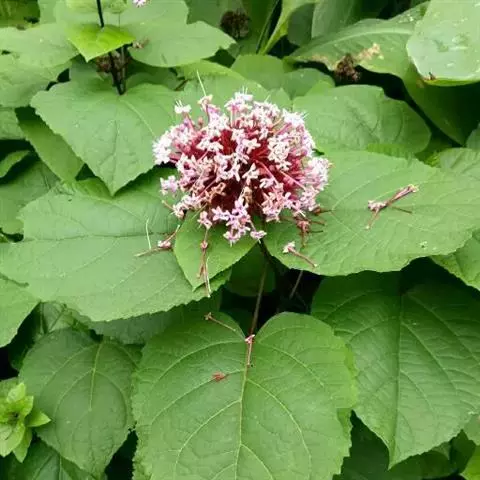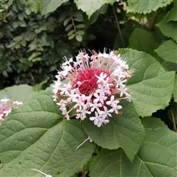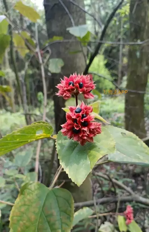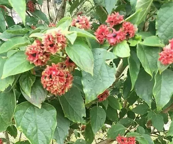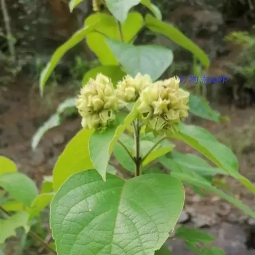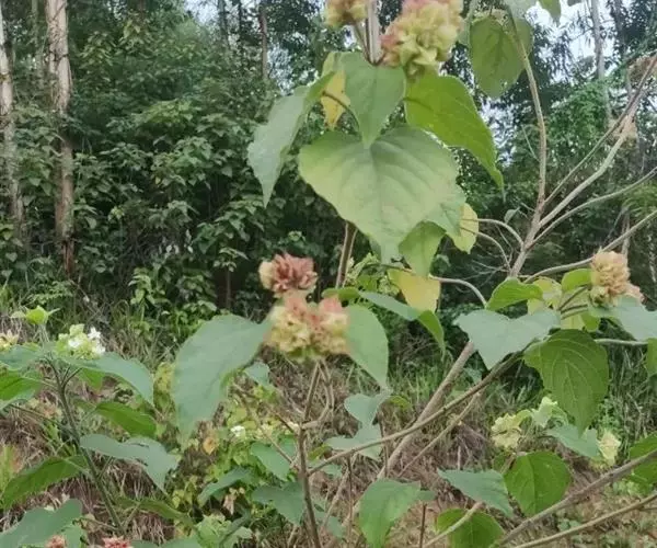 灌木,高1-3.5米;小枝略四棱形、具不明显的纵沟,全体密被平展或倒向灰褐色长柔毛,髓疏松,干后不中空。叶片心形或宽卵形,少为卵形,长6-18厘米,宽4-15厘米,顶端渐尖,基部心形至近截形,两面都有柔毛,脉上密被灰褐色平展柔毛,背面尤显著;叶柄长1.5-12厘米。聚伞花序密集成头状,通常2-5枝生于枝顶,花序梗较粗壮,长1.5-11厘米;苞片叶状,卵形或椭圆形,具短柄或近无柄,长0.5-2.4厘米;花萼由绿变红色,钟状,有5棱角,长约1.3厘米,有少数腺点,5深裂至萼的中部,裂片卵形或宽卵形,渐尖,花冠白色或淡红色,外有腺毛或柔毛,花冠管长约2厘米,纤细,裂片向外平展,倒卵状长圆形,长5-6毫米;雄蕊4枚,与花柱均伸出花冠外。核果近球形,径约7毫米,绿色,成熟时深蓝色或黑色,藏于红色增大的宿萼内。花果期4-10月。