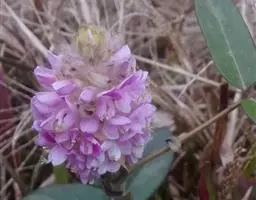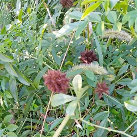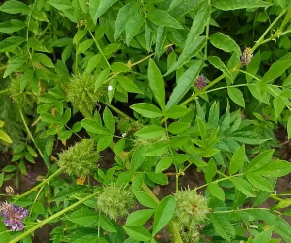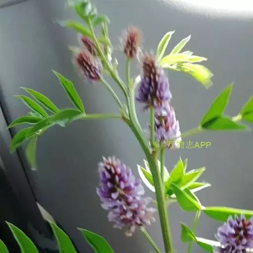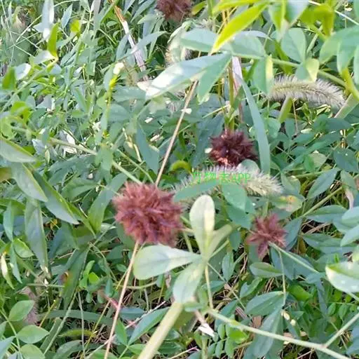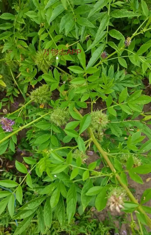 总状花序腋生,花密集成球状;总花梗短于叶,密生短柔毛及黄色鳞片状腺点;苞片卵状披针形,长6-8毫米,膜质,具腺点;花萼钟状,长4-5毫米,密被腺点,基部常疏被短柔毛;萼齿5,披针形,与萼筒近等长;花冠淡紫色、紫色或淡紫红色,旗瓣卵圆形,长6-8毫米,顶端圆,基部具短瓣柄,翼瓣长5-6毫米,龙骨瓣稍短于翼瓣。果序呈椭圆状,荚果卵圆形,长10-17毫米,宽6-8毫米,顶端具突尖,外面被长约5毫米刚硬的刺。种子2枚,黑色,圆肾形,长约2毫米。花期6-7月,果期7-9月。