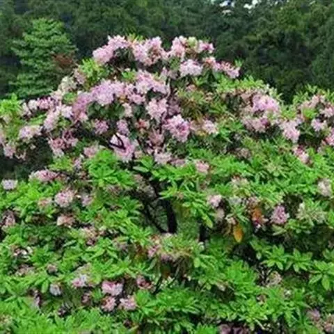 腺果杜鹃(学名:Rhododendron davidii Franch.):常绿灌木或小乔木,高1.5-5米,稀达8米;树皮黄褐色;幼枝绿色,无毛,老枝灰色,顶生冬芽卵形,无毛,叶厚革质,常集生枝顶,长圆状倒披针形或倒披针形,上面深绿色,下面苍白色。顶生伸长的总状花序,有花6-12朵;花冠阔钟形,长3.5-4.5厘米,玫瑰红色或紫红色,有时外面略具腺体,裂片7-8,卵形至圆形。蒴果短圆柱形,褐色。花期4-5月,果期7-8月。