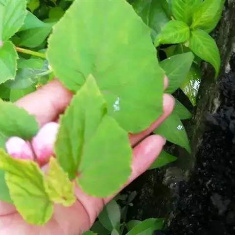 叶较小,椭圆状卵形至三角状卵形,长5-12(-20)厘米,宽3.5-9(-13)厘米,先端渐尖,下面色淡,偶带红色,基部心形,宽侧下延呈圆形,长0.5-4厘米,宽1.8-7厘米。