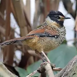黑顶噪鹛:中型鸟类,体长24-26厘米。前额、脸、颏、喉黑色,头顶黑褐沾棕或深棕橄榄褐色,…