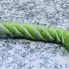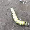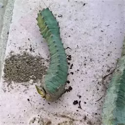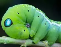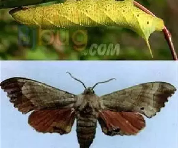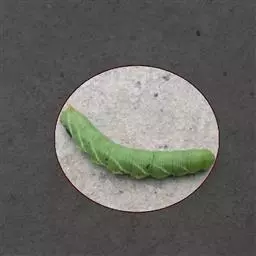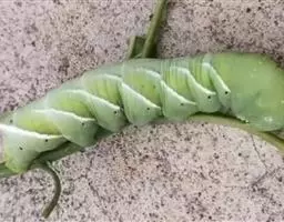 体长80mm,黄绿至绿色,体表密生黄白色颗粒。胸部侧面有一条、腹侧有7条黄色斜纹,自各节前缘下侧向上方斜伸,止于下l体节背侧近后缘,第7腹节者止于 尾角。尾角粗长,生于第8腹节背面。气门椭圆形,围气门片黑色。