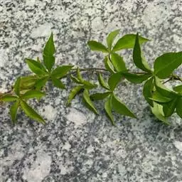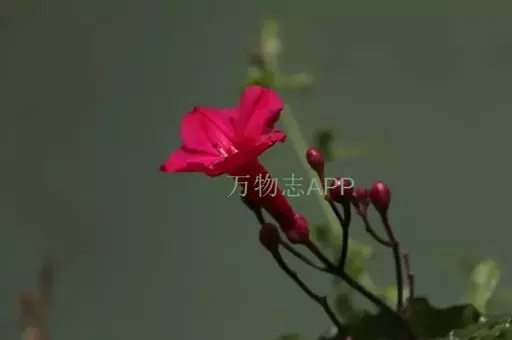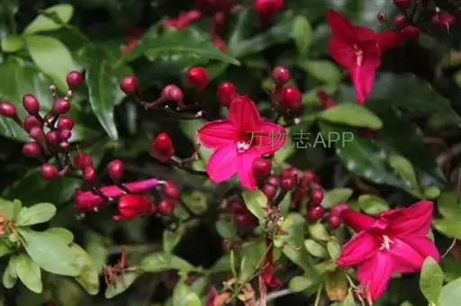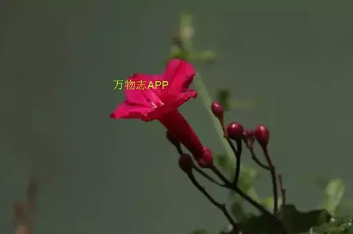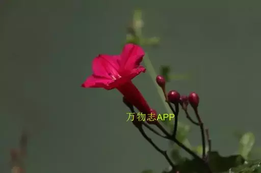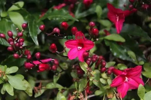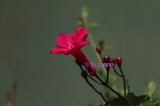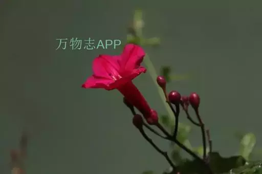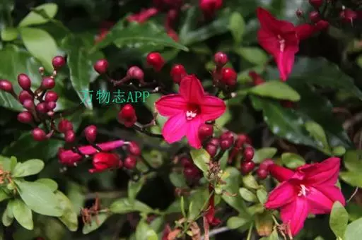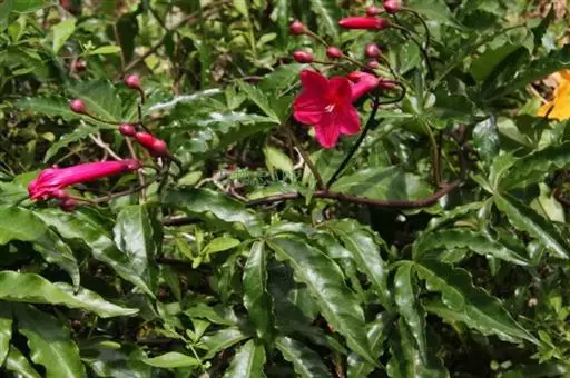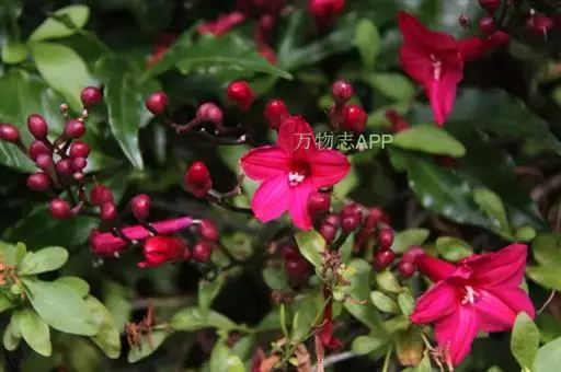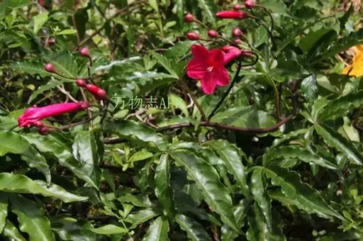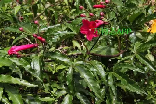多年生常绿蔓性藤本,深褐色。叶互生,掌状深裂,小叶3~5片,长椭圆形至披针形,革质,具花泽。花腋生,花冠喇叭状,先端五裂,红色。