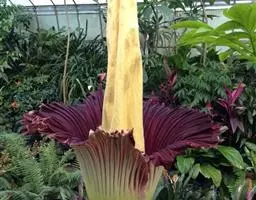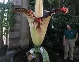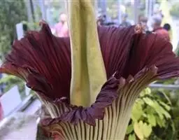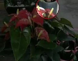 佛焰苞长10-25厘米,管部短,黄色;檐部略后仰,锐尖或渐尖,具锥状尖头,亮白色,有时带绿色。肉穗花序圆柱形,长6-9厘米,粗4-7毫米,黄色:雌花序长1-2.5厘米;雄花序长5-6.5厘米。子房3-5室,渐狭为花柱,大部分周围有3枚假雄蕊。
