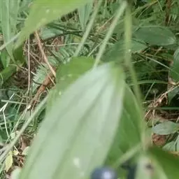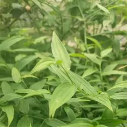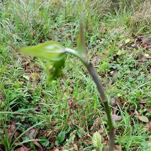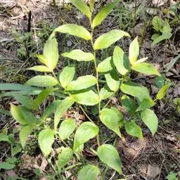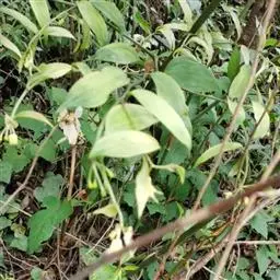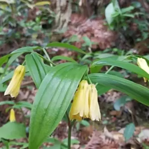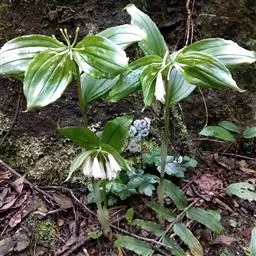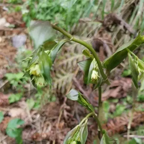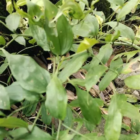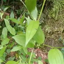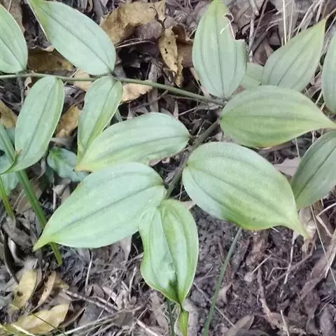 根状茎横出,呈结节状,有残留的茎基和圆盘状疤痕;根肉质,长可达30厘米,粗 1-4毫米,有纵皱纹或细毛,灰黄色。茎高30-70(100)厘米,上部有分枝。叶厚纸质,椭圆形、卵形至卵状披针形,长5-15厘米,宽2-6厘米,先端渐尖至尾状渐尖,下面脉上和边缘稍粗糙,基部近圆形;叶柄长0.5-1厘米。伞形花序有花2-6朵,生于茎和分枝顶端;花梗长1.5-2.5厘米,有乳头状突起;花被片白色或黄绿色,倒卵状披针形,长10-19毫米,先端尖,基部有长1(-2)毫米的短距;花丝等长或稍长于花被片,花药长3毫米,露出于花被外;花柱连同3裂柱头4-5倍长于子房,明显高出花药之上。浆果直径5-10毫米,有3-6颗种子。种子珠形或三角状卵形,直径 3-4毫米,棕色,有细皱纹。花期3-5月,果期6-11月。 [1-2]