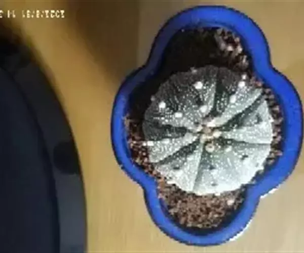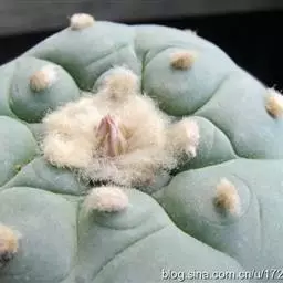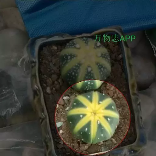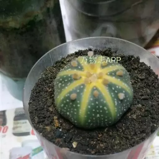 植株呈扁圆球形,直径5~8cm,球体由6~10条浅沟而分成6~10个扁圆棱。无刺,刺座上有白色星状 星兜、兜 绵毛。花着生于球顶部,漏斗形,黄色,花心红色,直径3~4cm。