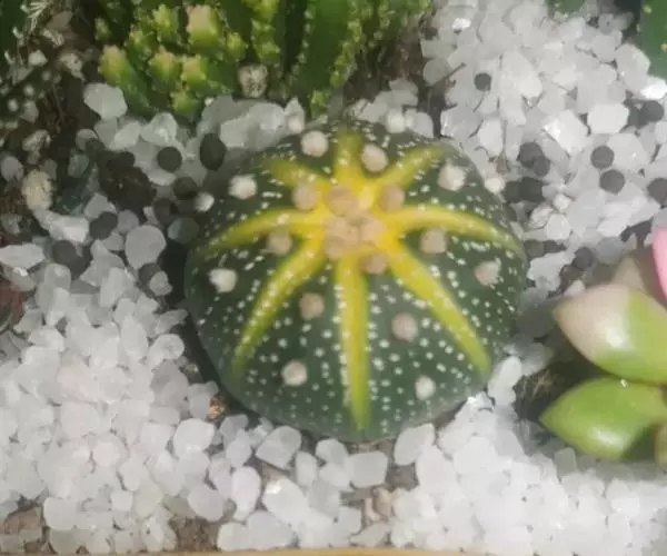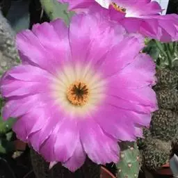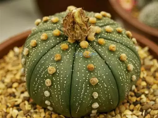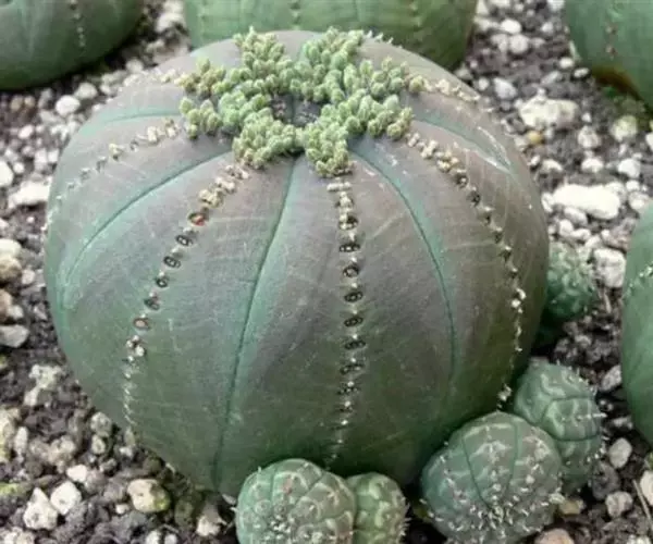 多年生仙人掌类植物。半球状,生长慢。高8~10cm,冠径10cm。茎无刺,约具8条低棱,棱上具小而成簇状的小窠。花亮黄色,径达6cm,夏季开放。