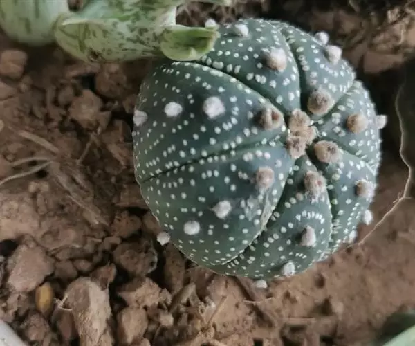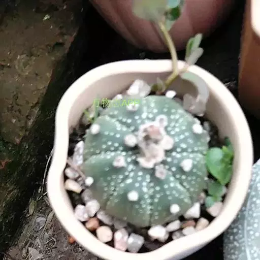 星兜,其拉丁学名为Astrophytum asterias。原产美国南部、墨西哥北部、东北和中部地区。植株呈扁圆球形,直径5~8cm,球体由6~10条浅沟而分成6~10个扁圆棱。无刺,刺座上有白色星状绵毛。花着生于球顶部,漏斗形,黄色或红色,花心红色。