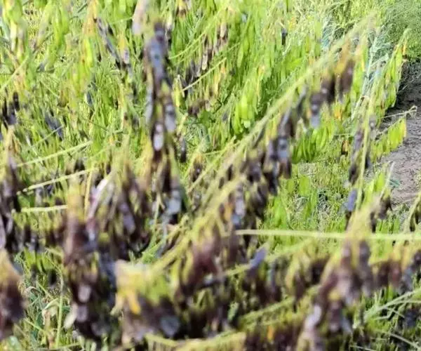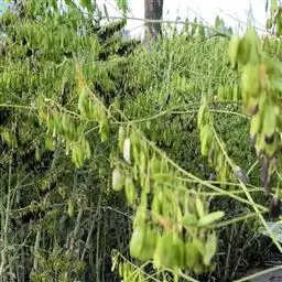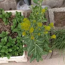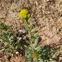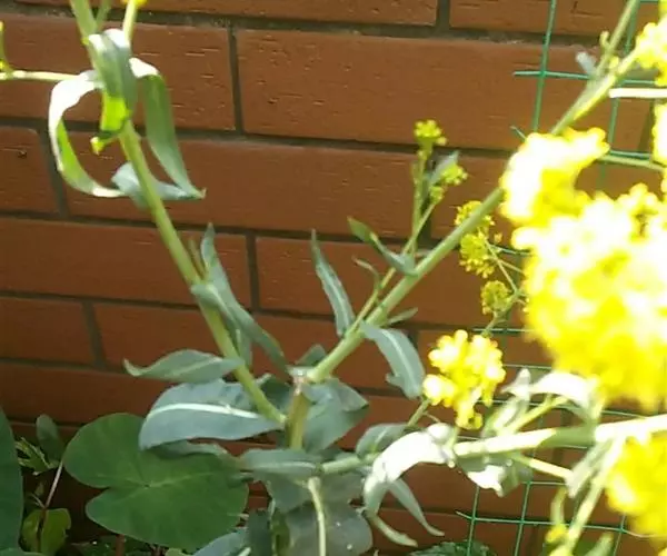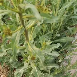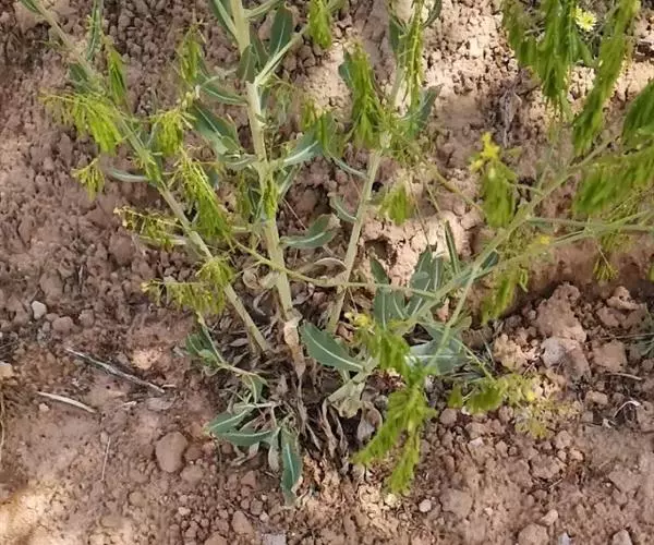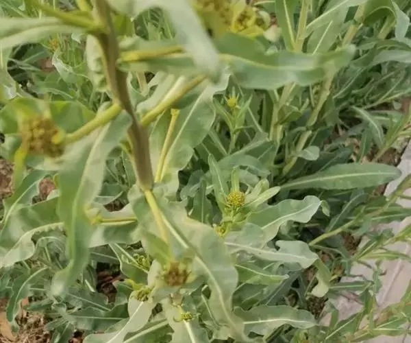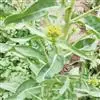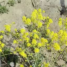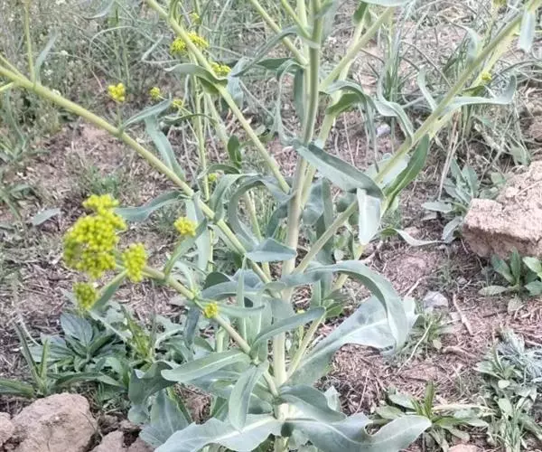 欧洲菘蓝 二年生草本,高30-80厘米。主根粗,径5-10毫米,灰黄色。茎直立,上部多分枝,无毛,稍有粉霜。基生叶有长柄,叶片长圆状椭圆形,基部渐狭,先端稍尖,通常全缘或略具波状齿;茎生叶无柄,披针形或长圆形,长3-6厘米,宽1-2厘米,基部箭形,抱茎,先端钝,全缘;茎上部叶线形。总状花序呈圆锥状;花黄色,直径7-10毫米;花梗纤细,下垂;萼片长圆形,开展,长约3毫米;花瓣狭倒卵形,长5-6毫米,有短爪;雄蕊6,花丝扁平,无牙齿;蜜腺在短雄蕊基部者呈环状,一侧微缺,在每对长雄蕊基部外侧者呈半月状;子房1室。短角果不开裂,两侧压扁,有翅,无隔膜,长圆形,长13-17毫米,宽3.5-5毫米,基部楔形,先端钝或微缺,具不明显肋。种子长圆状椭圆形,长约3毫米,黄褐色;子叶背倚。花期5月,果期6月。