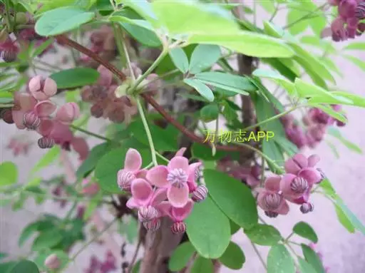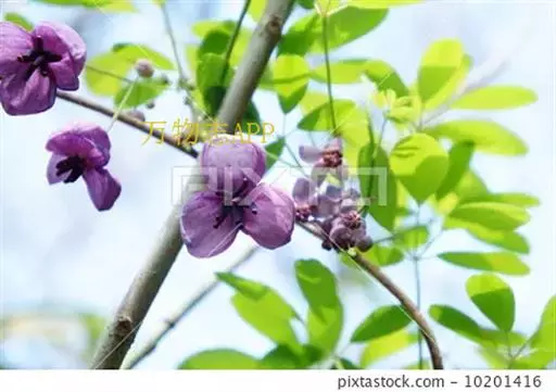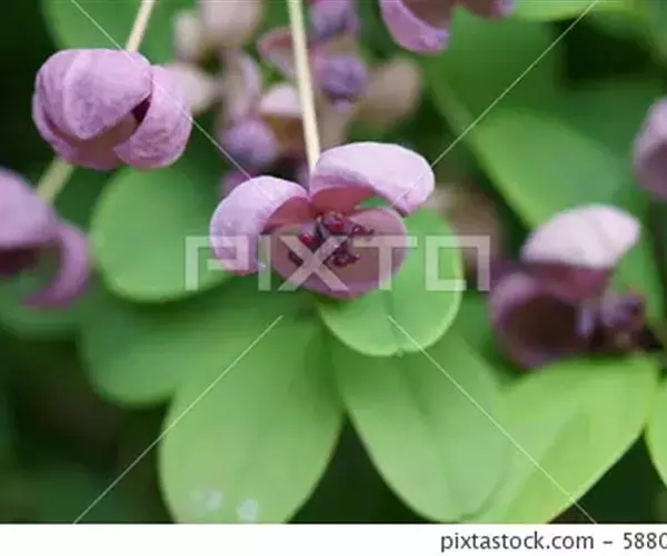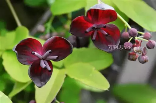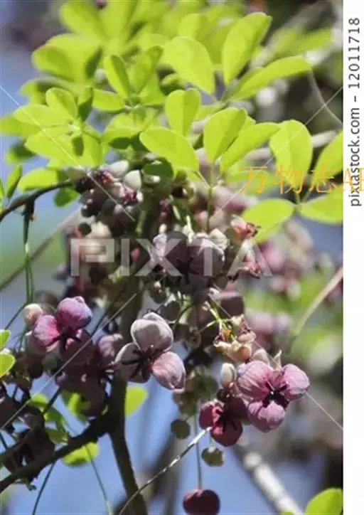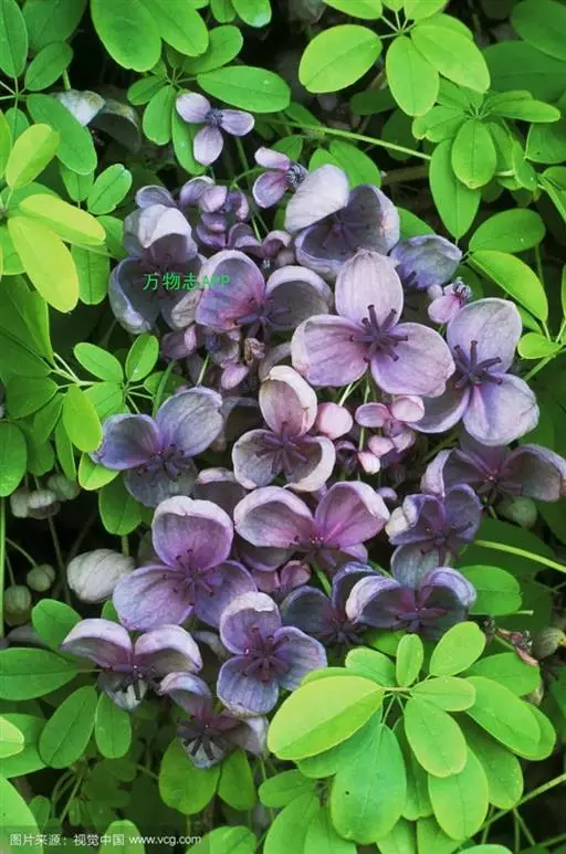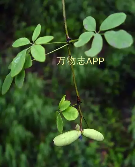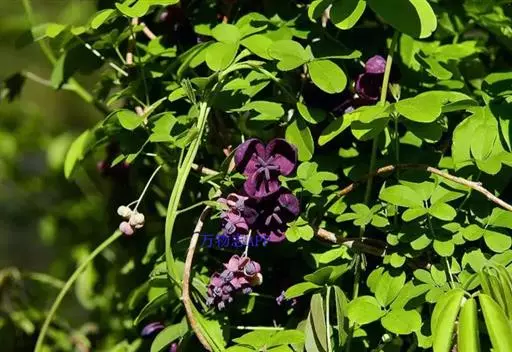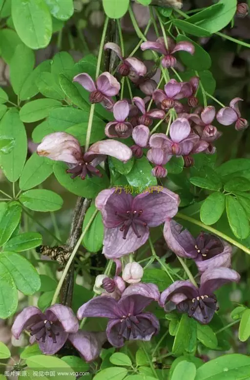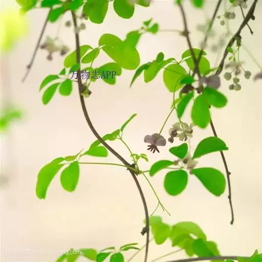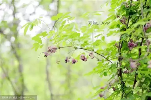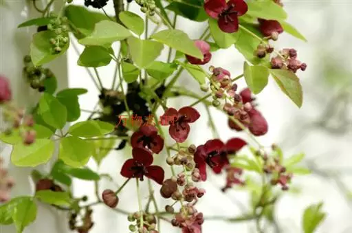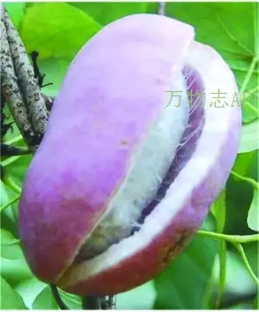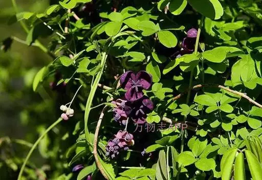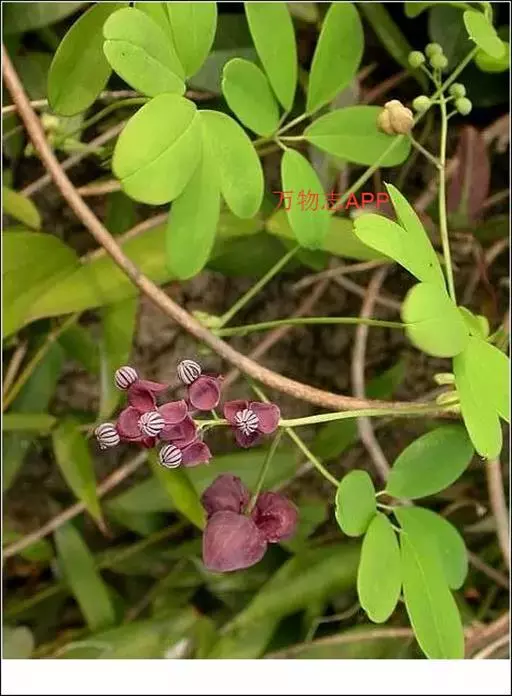 植物五叶木通,别名木通《中国植物志》。落叶木质缠绕藤本,长3~15米,全体无毛。幼枝灰绿色,有纵纹。掌状复叶,簇生于短枝顶端;叶柄细长。夏季开紫色花,短总状花序腋生。果肉质,浆果状,长椭圆形,略呈肾形,两端圆,长约8厘米,直径2~3厘米,熟后紫色,柔软,沿腹缝线开裂。种子多数,长卵形而稍扁,黑色或黑褐色。