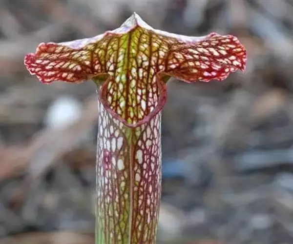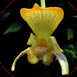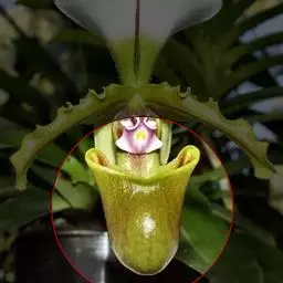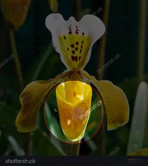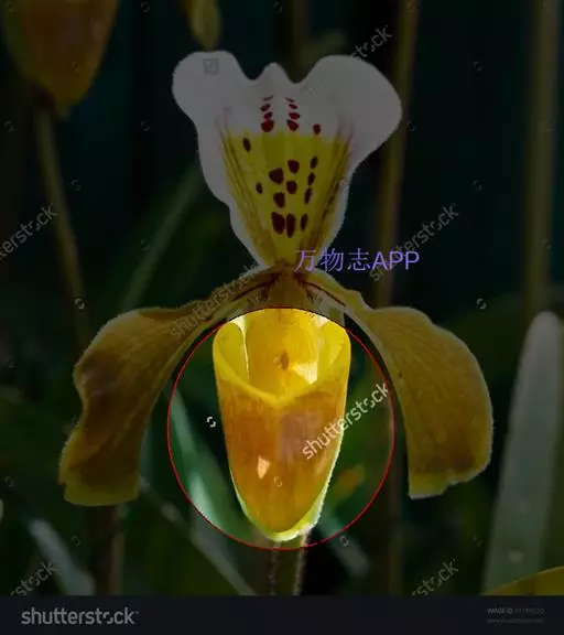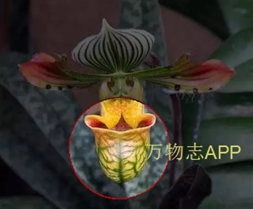 花瓣匙形或狭长圆状匙形,长5-7.5厘米,宽2-2.5厘米,先端常近截形或微凹,稍扭转,下部边缘皱波状且上面有时有黑色毛,边缘有缘毛,内表面基部有毛或近无毛;唇瓣倒盔状,基部具宽阔的、长约1.5厘米的柄;囊椭圆状圆锥形或近狭椭圆形,长2.5-3.5厘米,宽2-2.5厘米,囊口极宽阔,两侧各有1个直立的耳,两耳前方边缘不内折,囊底有毛;退化雄蕊近正方形,长与宽各8-10毫米,顶端近截形或有极不明显的3裂,基部有钝耳,上面中央和基部两侧各有1枚突起物,中央1枚较大,背面有龙骨状突起。花期4-5月。