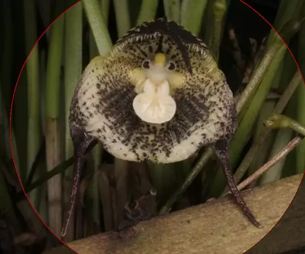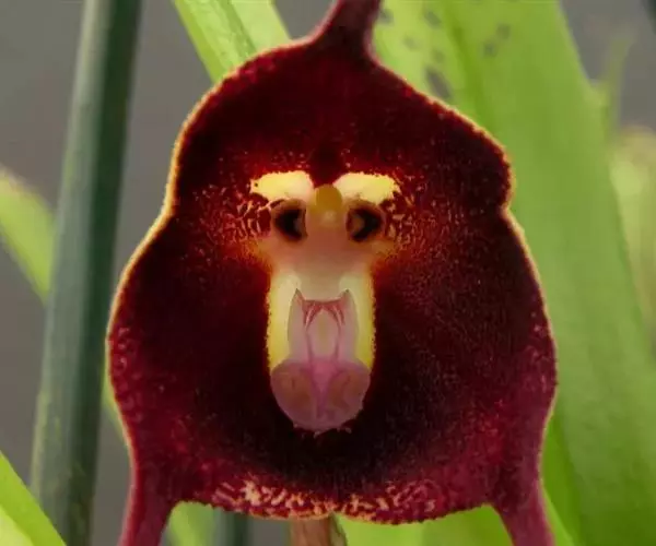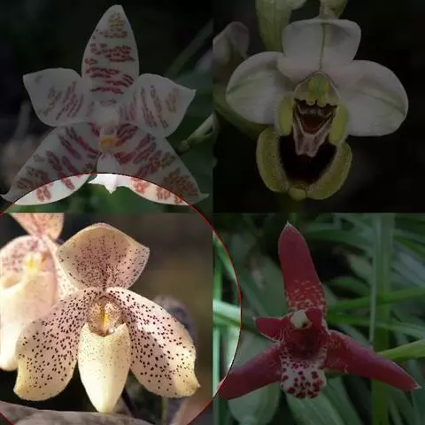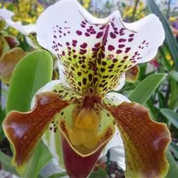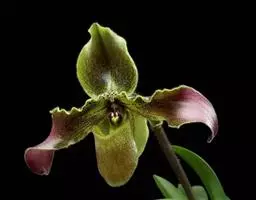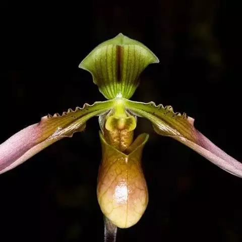 萼片绿色,棕色和紫色,背面龙骨状突起有紫色斑点。唇有绿色斑点。