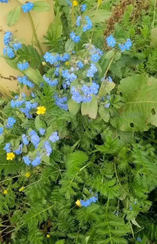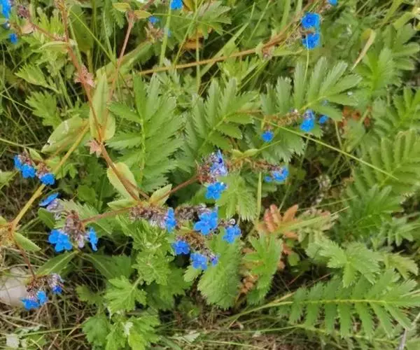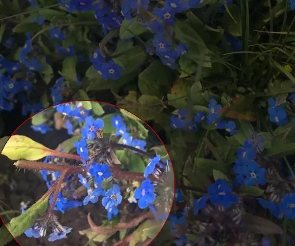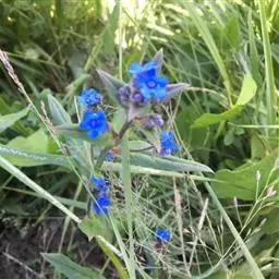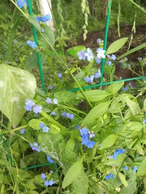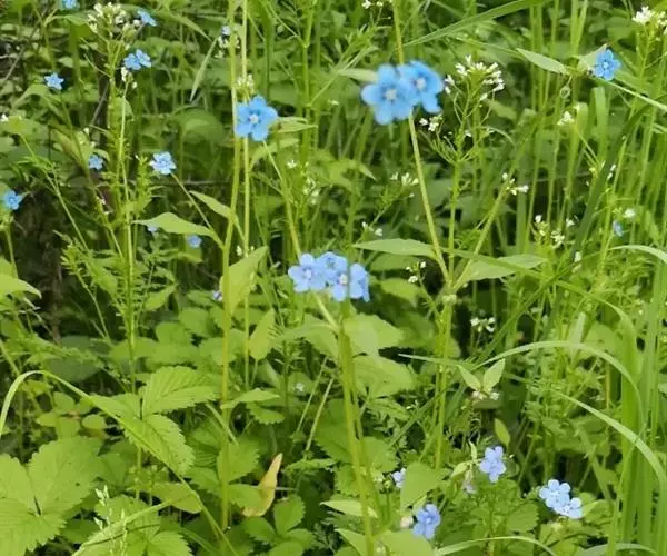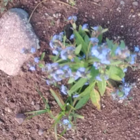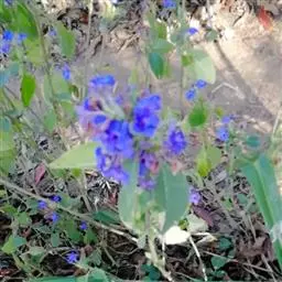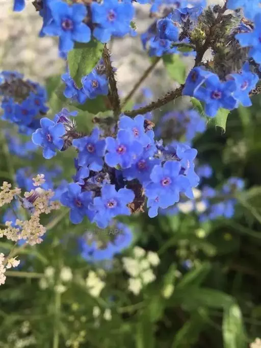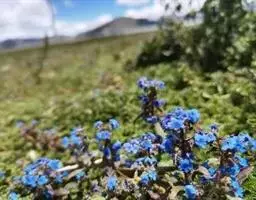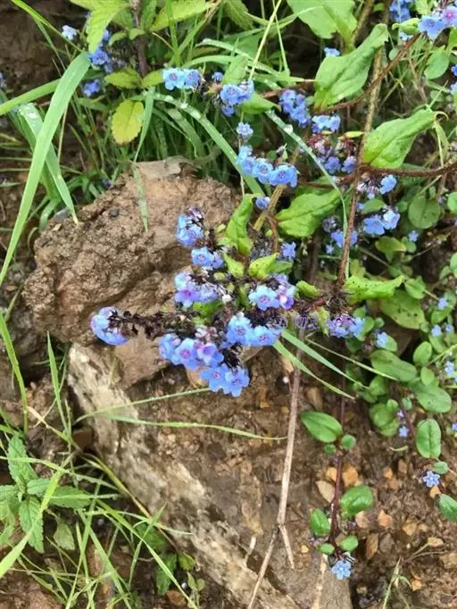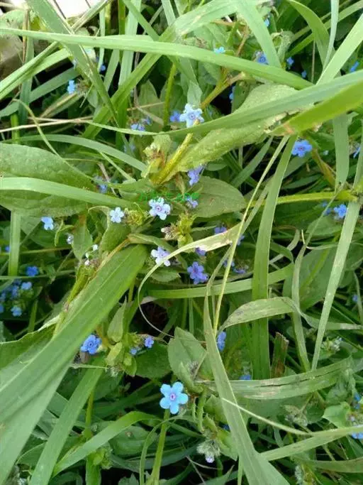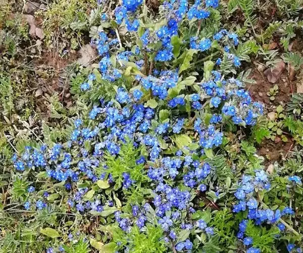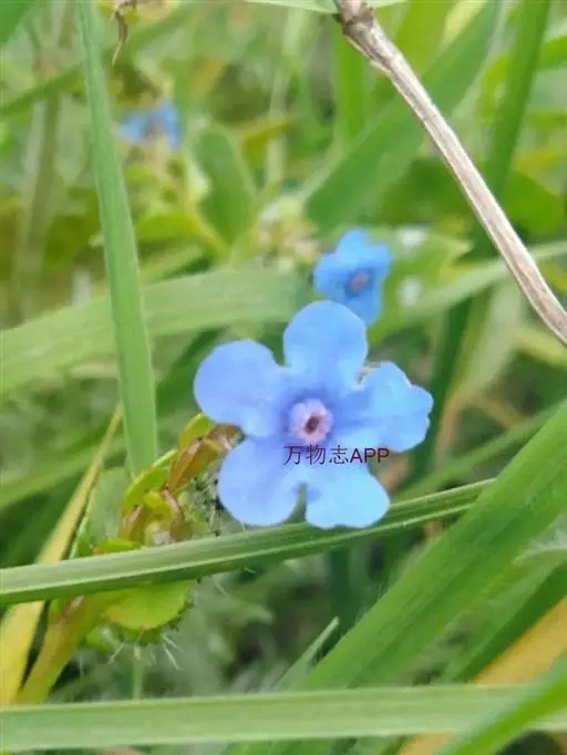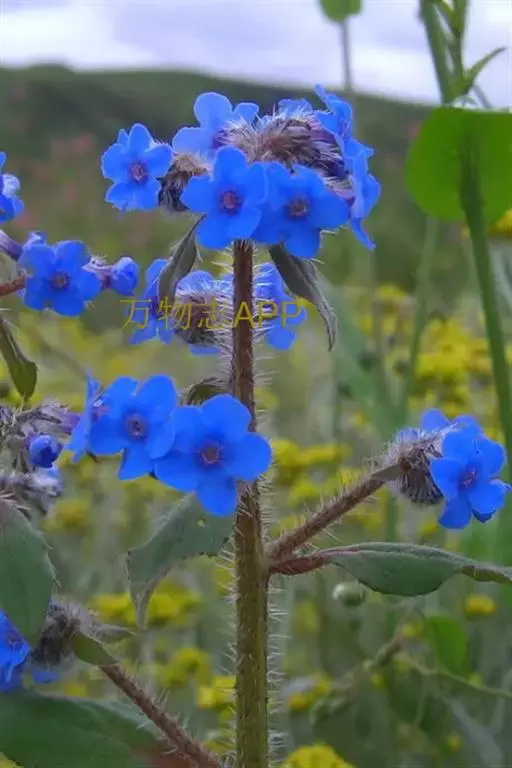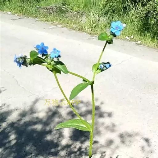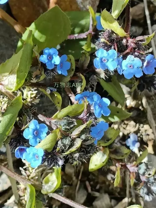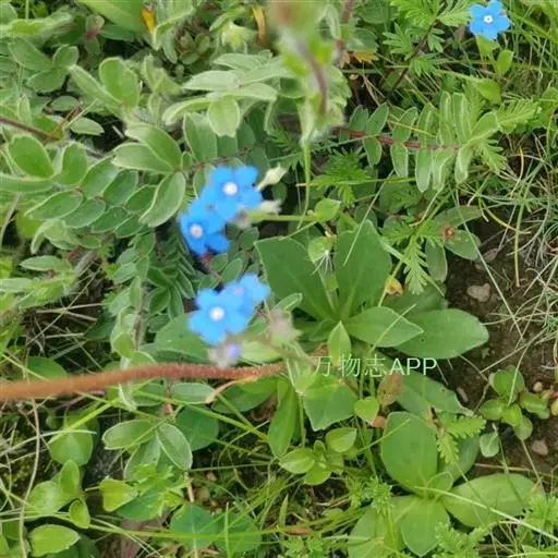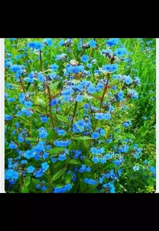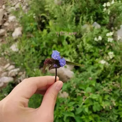 花序密集,直径0.5-1.5厘米,有时稍伸长,长约达2厘米,生茎顶端及无叶的分枝顶端,基部苞片叶状,其他苞片小,长0.5-2毫米;花梗短,密被短糙伏毛;花萼长约2毫米,果期长达3.5毫米,5裂近基部,裂片线形或狭三角形,外面疏被短柔毛和长糙毛,边缘密被短柔毛,内面有短伏毛;花冠蓝色或蓝紫色,檐部直径5-9(-11)毫米,无毛,裂片近圆形,筒部长2.5-3.8(-4)毫米,无毛,附属物低梯形或半月形,长约0.3毫米,无毛或有短毛。
