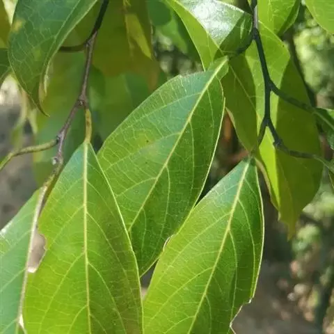 乔木,高可达17米,主干通直;树皮黑褐色,纵裂,叶互生,革质,长圆状椭圆形至倒卵椭圆形,长7-15厘米,宽3-7厘米,先端短尖或具短尾,基部楔形或近圆形,全缘或具不规则浅疏锯齿,表面深绿色,背面淡绿色,两面均无毛,侧脉6-10对,在表面微隆起,背面明显隆起,嫩叶干时黑色;叶柄长5-15毫米;托叶披针形,早落。