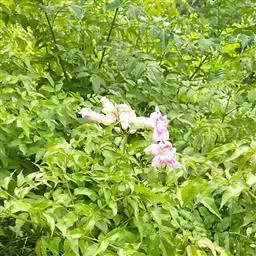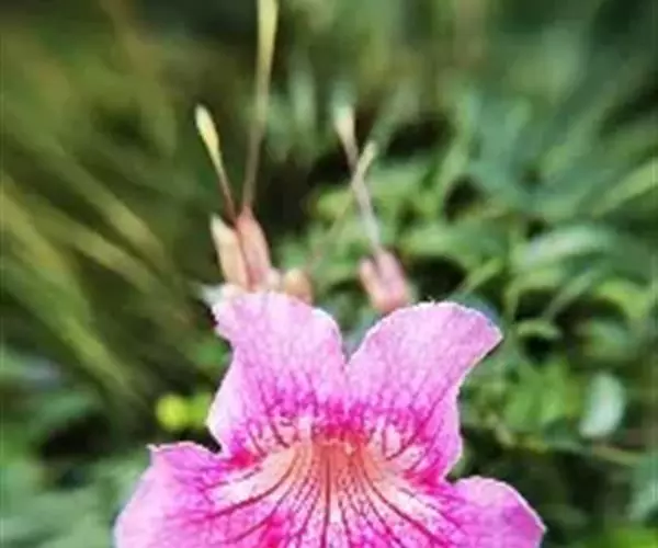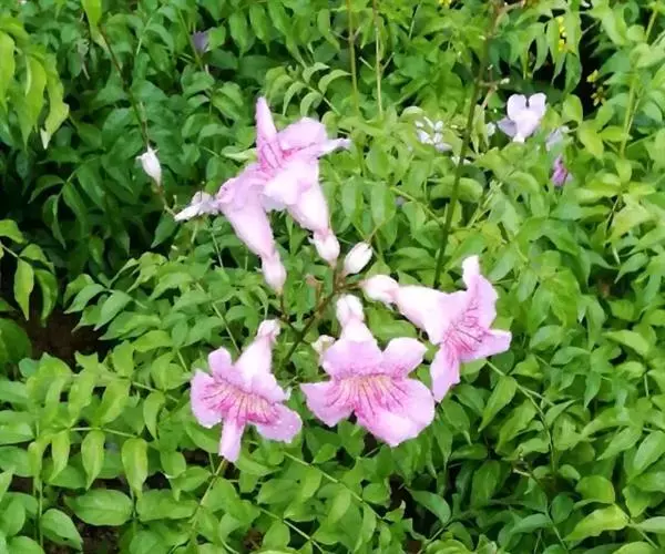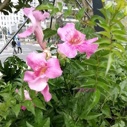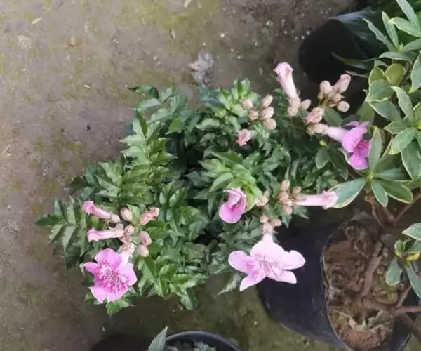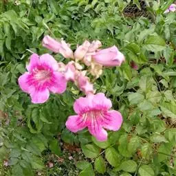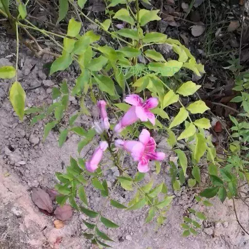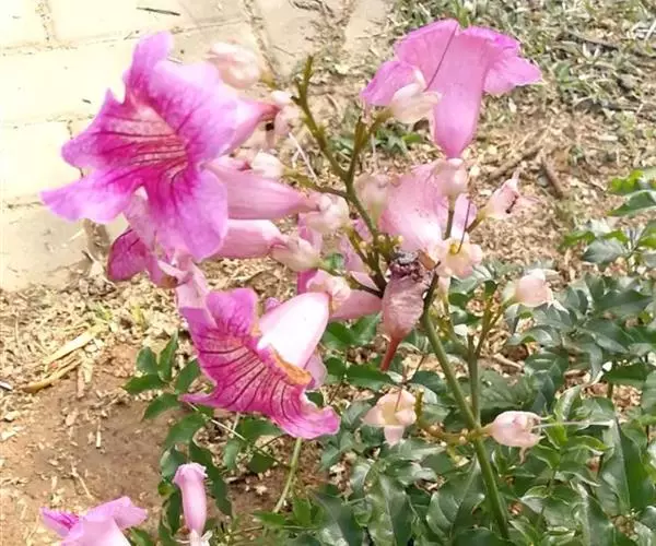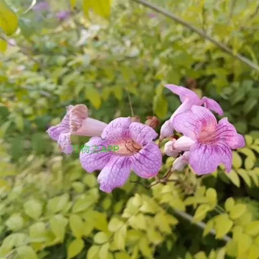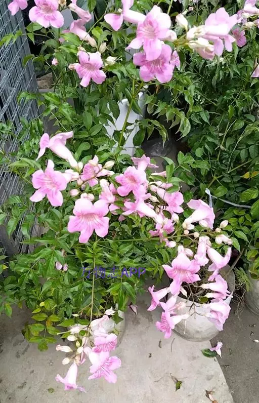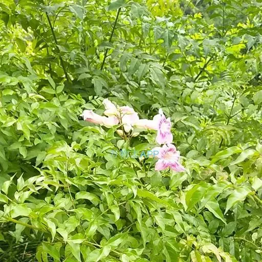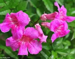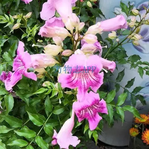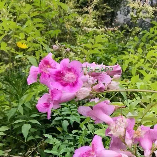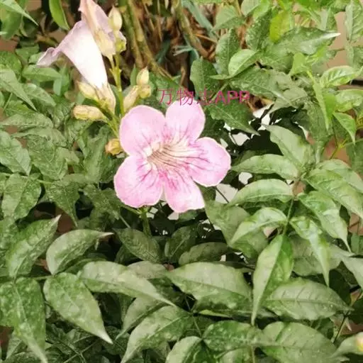 粉花凌霄 K.Schum.)是紫葳科魔盒凌霄属的落叶藤本植物。奇数羽状复叶对生,小叶全缘,…