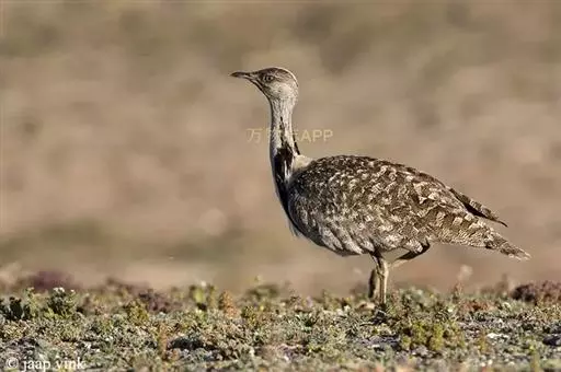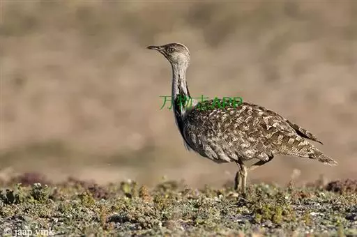 大鸨 大鸨成鸟两性体形和羽色相似,但雌鸟较小。繁殖期的雄鸟前颈及上胸呈蓝灰色,头顶中央从嘴基到枕部有一黑褐色纵纹,颏、喉及嘴角有细长的白色纤羽,在喉侧向外突出如须,长达10~12厘米。颏和上喉灰白色沾淡锈色。后颈基部栗棕色,上体栗棕色满布黑色粗横斑和黑色虫蠹状细横斑。初级飞羽和次级飞羽黑褐色,具白色羽基;大覆羽和大部分三级飞羽白色,中覆羽和小覆羽灰色,具白色端斑。前胸两侧具宽阔的栗棕色横带,下体余部白色。中央尾羽栗棕色,先端白色,具稀疏黑色横斑;尾羽的白色部分向两侧依次扩展,最外侧尾羽几乎全为纯白色,仅具黑色端斑。
