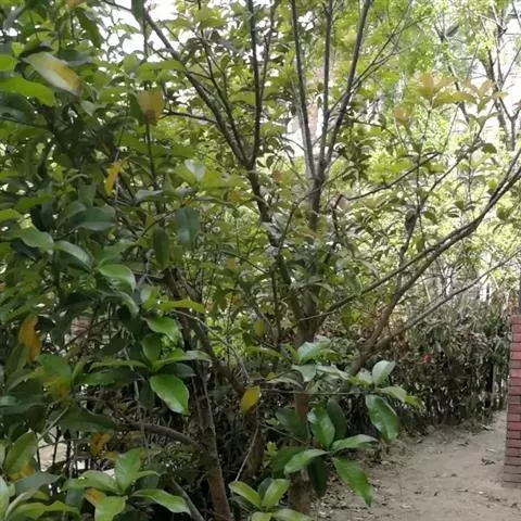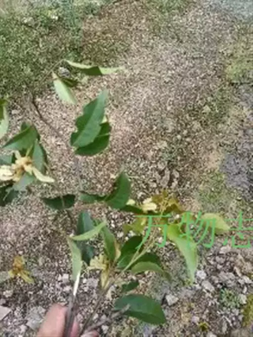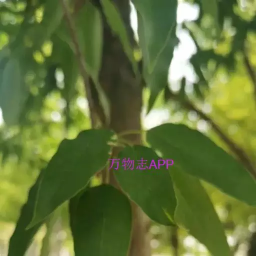 常绿乔木,常高10米,稀达20米。树皮灰色或深灰色,粗糙,裂成薄片脱落。小枝细瘦,近于圆柱形;当年生嫩枝紫色或紫绿色,近于无毛;多年生老枝褐色或深褐色。冬芽小,褐色,近于无毛。叶革质,长圆卵形,长5-7厘米,宽3-4厘米,全缘,基部钝形或近于圆形,先端渐尖或钝尖;下面有白粉;主脉在上面显著,在下面凸起,侧脉6-7对,基部的一对侧脉较长,其长度约为叶片的1/3-1/2,小叶脉显著,成网状;叶柄长2-3厘米,黄绿色,无毛。