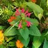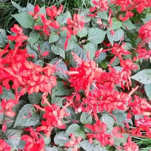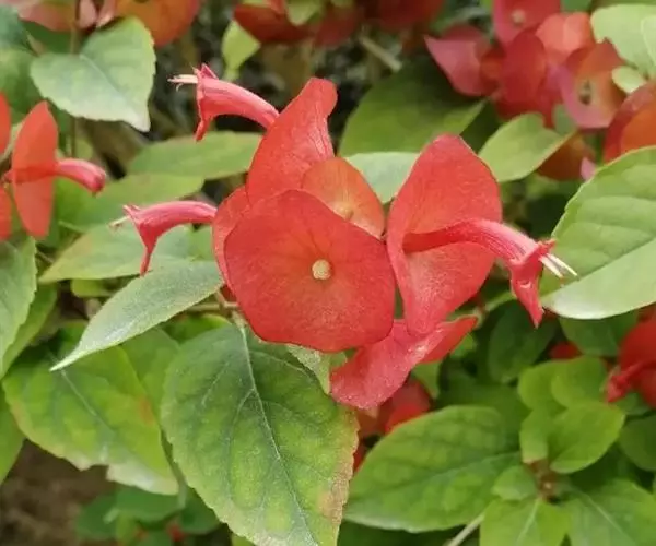 聚伞花序常2-6个再组成圆锥状,每聚伞花序有3花,中间的一朵花柄较两侧为长,花柄及花序梗具短腺毛及长单毛;花萼朱红色或橙红色,由基部向上扩张成一阔倒圆锥形的碟,直径可达2厘米,边缘有稀疏睫毛,网状脉明显;花冠殊红色,花冠管长2-2.5厘米,有腺点;雄蕊4,花丝长2.5-3厘米,具腺点。