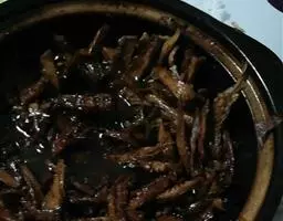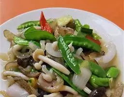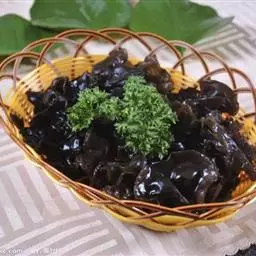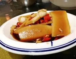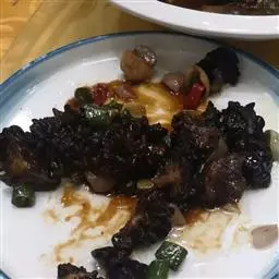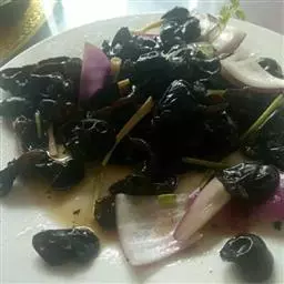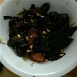 平底锅,热锅倒入油,在油中放入八角和辣椒,无油的地方放入蒜瓣和Dried Mixed Herbs,油开始冒泡后,在无油的地方放入切成细条状得西芹,然后加入黑胡椒后翻炒2分钟,放滚刀切好的大葱,加入甜鸡酱后,再放入木耳,稍微翻炒后,盖上盖子3分钟左右,加入黑胡椒,少量盐,加入热水,大火沸煮,水差不多收干后,再加入盐,加少量沸水,收汁时再加一次甜鸡酱和黑胡椒,关火盖盖,焖3分钟后装盘.