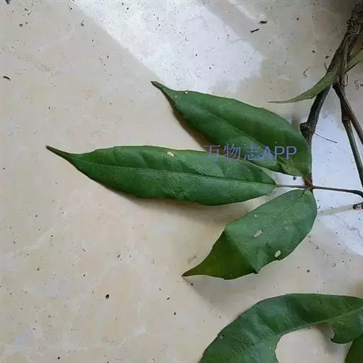 叶片纸质,鲜时表面深绿色,背面淡绿色,干后表面黄绿色,背面淡黄色,椭圆形,披针状卵形至披针状长圆形,长6-13厘米,宽1.5 5-5.6厘米,先端渐尖至长渐尖,常有芒状尖头,基部钝;中肋在表面稍下陷,背面隆起,侧脉4对,最下一对基出,弧形上升,细脉多数,近平行;叶柄倒卵状长圆形或楔形,长1-4厘米,宽0.5-1.2厘米,约为叶片大小的1/6。