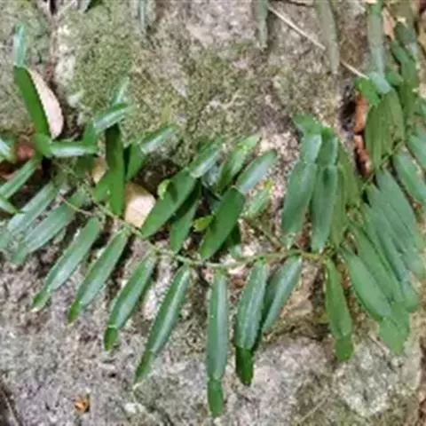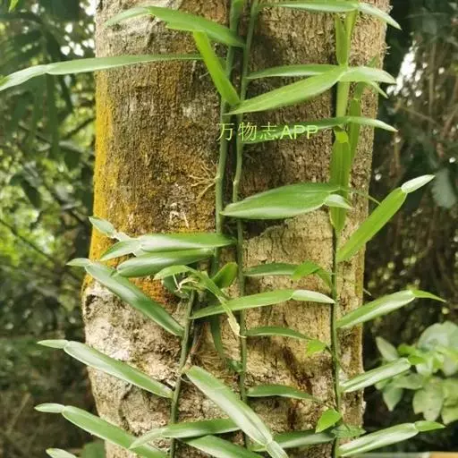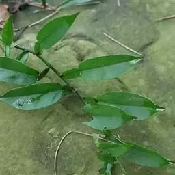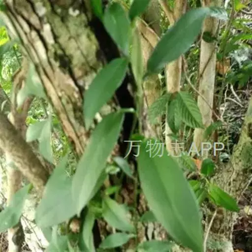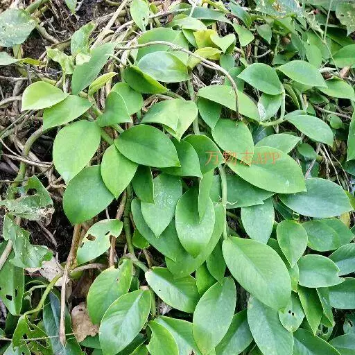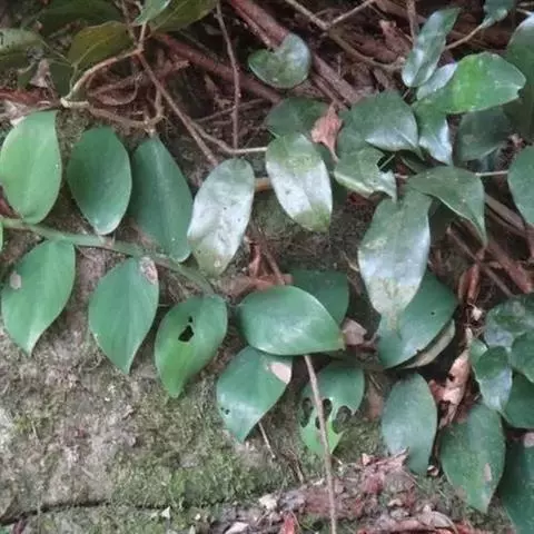 石柑子(Pothos chinensis (Raf.) Merr.):又名竹结草、爬山虎、巴岩香、百步藤。是单子叶植物纲、天南星科、石柑属附生藤本。茎亚木质,淡褐色,近圆柱形,具纵条纹,节上常束生长1-3厘米的气生根;分枝;叶片纸质,长6-13厘米,宽1.5 5-5.6厘米;中肋在表面稍下陷,背面隆起,侧脉4对;叶柄倒卵状长圆形或楔形,长1-4厘米,宽0.5-1.2厘米。花序腋生,基部具苞片4-5枚;苞片卵形,长5毫米;浆果黄绿色至红色,卵形或长圆形,长约1厘米。花果期四季。