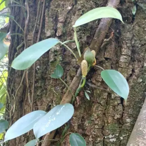 附生藤本,长0.4-6米。茎亚木质,淡褐色,近圆柱形,具纵条纹,粗约2厘米,节间长1-4厘米,节上常束生长1-3厘米的气生根;分枝,枝下部常具鳞叶1枚;鳞叶线形,长4-8厘米,宽3-7毫米,锐尖,具多数平行纵脉。