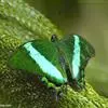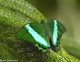 外观特征:展翅宽80~90mm。雄蝶下翅表面具1大块有强烈金属光泽的蓝绿色斑纹,雄蝶此斑纹上下呈细条状延伸。