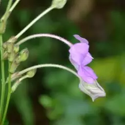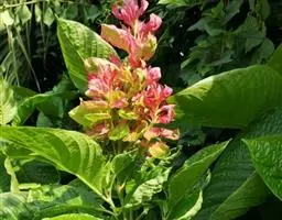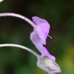 聚伞圆锥花序穗状,顶生,长14-18厘米,宽6-8厘米;花具梗,梗长5-8米米,密被短绒毛;苞片和小苞片微小;花萼5裂至下部,基部联合,裂片三角状披针形,长约5-7米米,密生微毛;花冠紫红色,长约5厘米,外密被倒生黄褐微毛和腺毛,花冠管长约4.2厘米,略向下弯,冠檐2唇形,上唇2裂,下唇3深裂;雄蕊2,着生近花冠管基部,稍外露,花药2室,背着生,椭圆形,花丝基部附近有2退化雄蕊的残迹。蒴果长,圆柱形,约3.5厘米,具10粒种子。