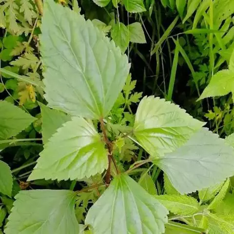 叶对生,有时上部的叶近互生,宽或长卵形,或三角状卵形,中部茎叶长2-6厘米,宽1.5-3.5厘米,或长宽相等。自中部向上及向下和腋生的叶渐小或小。全部叶有叶柄,柄长0.7-3厘米,边缘有规则的圆锯齿,齿大或小,或密或稀,顶端圆形或急尖,基部心形或平截,三出基脉或不明显五出脉,两面被稀疏或稠密的白色柔毛,下面及脉上的毛较密,上部叶的叶柄、腋生幼枝及幼枝叶的叶柄通常被开展的白色长绒毛。