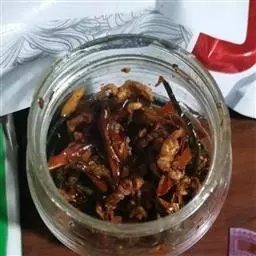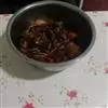 6、碗里准备好油辣椒或者辣椒酱,在5中的香料入锅炒变色后迅速捞起放入油辣椒搅拌匀。