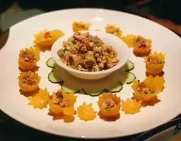 口水鸡是四川省的一道传统名菜,属于川菜,该菜品佐料丰富,集麻辣鲜香嫩爽于一身。 在烹制时,煮鸡用的汤料很有讲究,需要恰到好处,这样可以最大限度地保存鸡的可溶性蛋白,增加鸡肉的鲜美程度,又能具备其特有的香型和滋味。