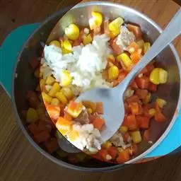 5. 加入米饭、葱花、味精、精盐,用中火翻炒10分钟左右;