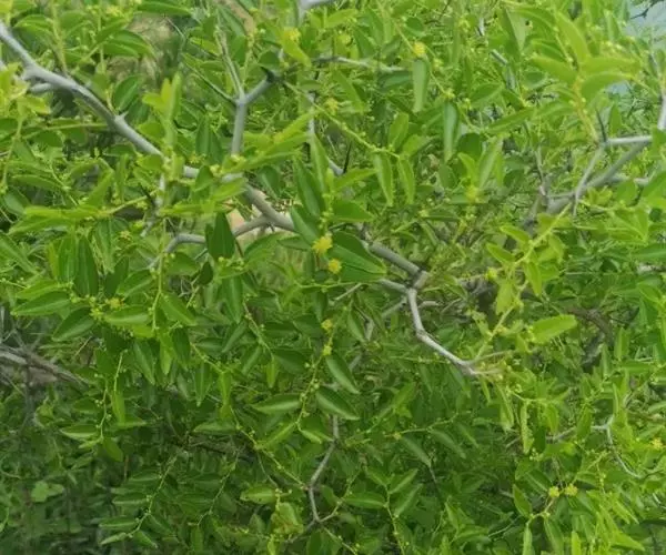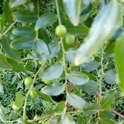酸枣:落叶灌木或小乔木,高1-4米;小枝称之字形弯曲,紫褐色。酸枣树上的托叶刺有2种,一种直伸,长达3厘米,另一种常弯曲。叶互生,叶片椭圆形至卵状披针形,长1.5-3.5厘米,宽0.6-1.2厘米,边缘有细锯齿,基部3出脉。花黄绿色, 2-3朵簇生于叶腋。核果小,近球形或短矩圆形,熟时红褐色,近球形或长圆形,长0.7-1.2厘米,味酸,核两端钝。花期6-7月,果期8-9月。