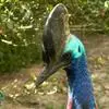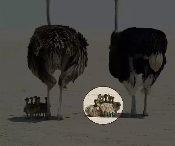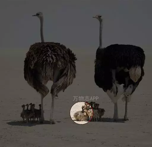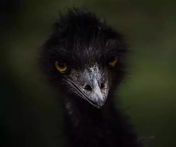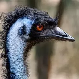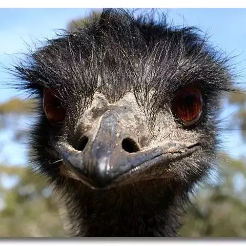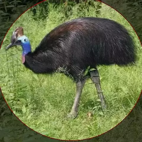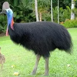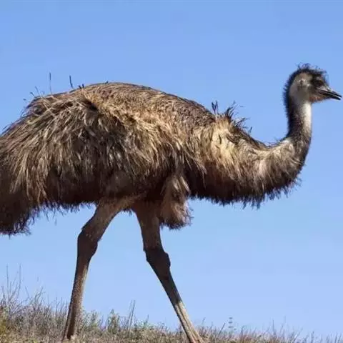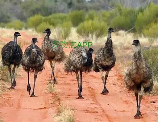 鸸鹋,体高150-185厘米,体重30-45千克,寿命10年。成年雌性比雄性大。鸸鹋形似非洲鸵鸟而较小,属于平胸类,没有龙骨,嘴短而扁,羽毛灰色、褐色或黑色,长而卷曲自颈部向身体的两侧覆盖。翅膀退化,完全无法飞翔。足三趾,腿长善走。羽毛发育不全,具纤细垂羽,副羽甚发达,头、颈有羽毛、无肉垂。体健壮,腿长,同其亲属鹤鸵一样。两性体羽均为褐色,头和颈暗灰,颈部裸露的皮肤呈蓝色,喙为灰色,翅膀隐藏在残留的羽毛下,在炎热的天气,可以促进机体冷却。庞大的身体是由两个强大的灰色的三趾腿支撑。雏鸟有一个蓬松羽毛的头,身体由棕色和黑色条纹的羽毛组成。鸸鶓的跑速每小时可达50千米,被困时用三趾的大脚踢人。