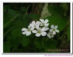 白花酢浆草为多年生草本,高8-10厘米。根纤细;根茎横生,节间具1-2毫米长的褐色或白色小鳞片和细弱的不定根。茎短缩不明显,基部围以残存覆瓦状排列的鳞片状叶柄基。叶基生;托叶阔卵形,被柔毛或无毛,与叶柄茎部合生;叶柄长3-15厘米,近基部具关节;小叶3,倒心形,长5-20毫米,宽8-30毫米,先端凹陷,两侧角钝圆,基部楔形,两面被毛或背面无毛,有时两面均无毛。总花梗基生,单花,与叶柄近等长或更长;花梗长2-3厘米,被柔毛;苞片2,对生,卵形,长约3毫米,被柔毛;萼片5,卵状披针形,长3-5毫米,宽1-2毫米,先端具短尖,宿存;花瓣5,白色或稀粉红色,倒心形,长为萼片的1-2倍,先端凹陷,基部狭楔形,具白色或带紫红色脉纹;雄蕊10,长、短互间,花丝纤细,基部合生;子房5室,花柱5,细长,柱头头状。蒴果卵球形,长3-4毫米。种子卵形,褐色或红棕色,具纵肋。花期7-8月,果期8-9月。2n=22, 24。