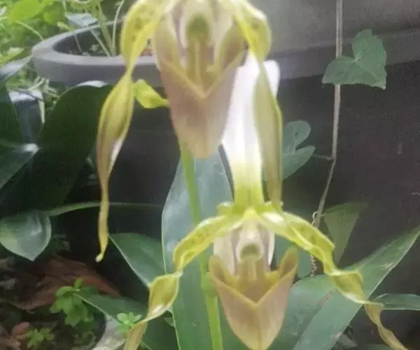 花葶近直立,长30-80厘米,绿色,无毛或较少略被短柔毛;总状花序具2-4花;花苞片宽卵形,长与宽各约长2厘米,先端钝并常有3小齿,近无毛;花梗和子房长达5.5厘米,无毛;花大;中萼片与合萼片白色而有绿色的基部和淡黄绿色脉,花瓣淡绿色或淡黄绿色并有深色条纹或褐红色晕,唇瓣绿黄色并有浅栗色晕,退化雄蕊淡绿黄色而有深绿色斑块;中萼片近椭圆形,长4-5.5厘米,宽1.8-2.5厘米,先端具短尖,边缘向后弯卷,内表面基部具短柔毛,背面中脉呈龙骨状突起;合萼片与中萼片相似,但稍宽而短,背面略有2条龙骨状突起;花瓣下垂,长带形,长8.5-12厘米,宽6-7毫米,扭曲,从中部至基部边缘波状,可见数个具毛的黑色疣状突起或长柔毛,有时疣状突起与长柔毛均不存在;唇瓣倒盔状,基部具宽阔的、长达2厘米的柄;囊近椭圆状圆锥形或卵状圆锥形,长2.5-3厘米,宽2-2.5厘米,囊口极宽阔,两侧各有1个直立的耳,两耳前方边缘不内折,囊底有毛;退化雄蕊倒心形或倒卵形,长1-1.2厘米,宽8-9毫米,先端有弯缺,上面基部有1个角状突起,沿突起至蕊柱有微柔毛,背面有龙骨状突起,边缘具细缘毛。