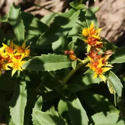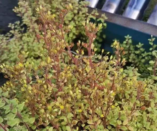 一年生或二年生草本。植株被腺毛。茎直立,有多数斜上的分枝,基部呈木质,高10-15厘米,褐色,被腺毛。叶互生,正三角形或三角状宽卵形,长7-15毫米,宽5-10毫米,先端急尖,基部宽楔形至截形,入于叶柄,柄长4-8毫米,全缘。总状聚伞花序;花顶生,花梗长5-10毫米,萼片5,披针形至长圆形,长1-2毫米,先端渐尖;花瓣5,黄色,披针状长圆形,长3-5毫米,先端渐尖;雄蕊10,较花瓣短;鳞片5,宽匙形至宽楔形,长0.3毫米,先端有微缺;心皮5,近直立,长圆形,长约4毫米,花柱短。蓇葖下部合生,上部略叉开;种子长圆状卵形,长0.3毫米,有纵纹,褐色。花期6-7月(湖北及以南)至7-8月(华北及西南高山),果期8-9月。