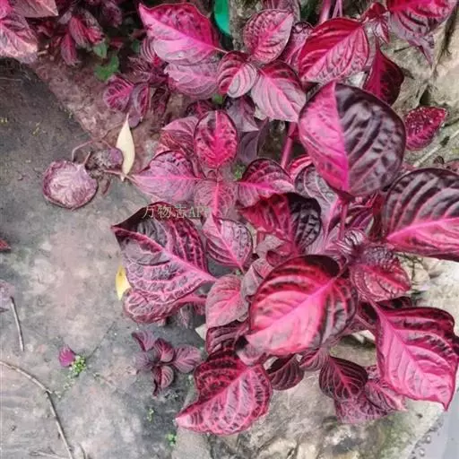 叶玫瑰红色,中心深紫红色,周围具白色斑纹,主脉红色。