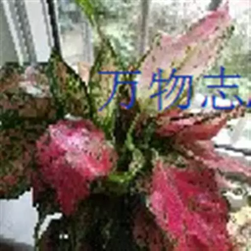 大叶种,叶中心为乳白色,叶缘绿色,主脉白色,叶面嵌有深红斑块;