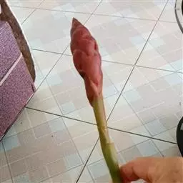 花:花序柄短于叶柄,长10-13厘米(河口标本)。佛焰苞管部卵圆形,长3厘米,外面绿色,内面绿白色、基部常青紫色;檐部长约5厘米,凸尖,白色。肉穗花序:雌花序几与雄花序相等,长约1.5厘米,雄花序纺锤形,长3厘米,中部粗7毫米,向两头渐狭。花期4月(云南河口)。