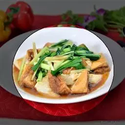 1. 豆腐切成薄块,锅中油至7成热,将豆腐块放入锅中,煎至两面金黄。