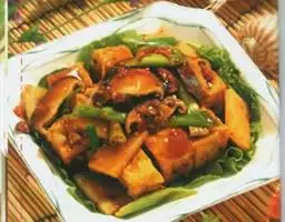 脆皮豆腐是一道地方传统名菜,属于素菜。皮酥脆内细嫩的豆腐莱肴,表皮松脆,内嫩香醇。制作脆皮豆腐的关键是炸脆皮豆腐生坯.它需要在豆腐表面挂上一层糊.再下入油锅中炸至表皮酥脆,脆皮豆腐生坯炸好后。调味就简单了,既可将勾好的茄汁味汁或糖醋味汁浇淋在豆腐上,也可随配椒盐味碟、茄汁味碟或糖醋味碟上桌。