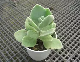 唐印(Kalanchoe thyrsifolia),为景天科、伽蓝菜属多年生肉质草本植物,原产南非开普敦省和德兰士瓦省。英文名为Paddle plant、Desert‘s cabbage,株高约50~60公分,宽约20~30公分,茎稍粗,上附白粉,呈灰白色,分枝多;叶对生,排列紧密,形似蔷薇花型,叶型近似卵形的圆形,长10~15公分,宽5~10公分,全缘,先端钝。叶色淡绿,上披有一层厚厚的白粉,呈灰绿色,叶缘有一圈红色线条,在冷凉季节,于阳光充足的户外,叶缘会出现渐层的红色色斑。从茎顶伸出50~70公分的花茎,花筒形,黄色,长约1.5公分左右,排列紧密,为圆锥花序;花朵会持续开放很长一段时间,直到花茎上长出不定芽的花梗苗,母株即会枯萎。茎粗壮,叶形叶色较美,有一定的观赏价值。