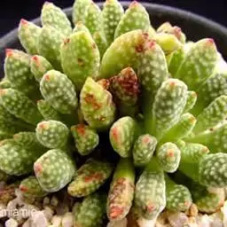 蓝黛莲是一种景天科厚叶草属植物。叶片呈略扁的圆柱形,排列成莲座状;颜色为灰绿色,…